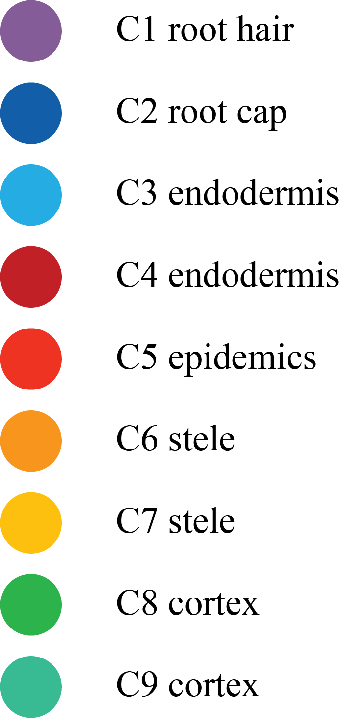 We annotated 9 clusters from 20,863 cells and 17,486 cells which represent different spatial distribution of root tips in normal and HS, respectively. |