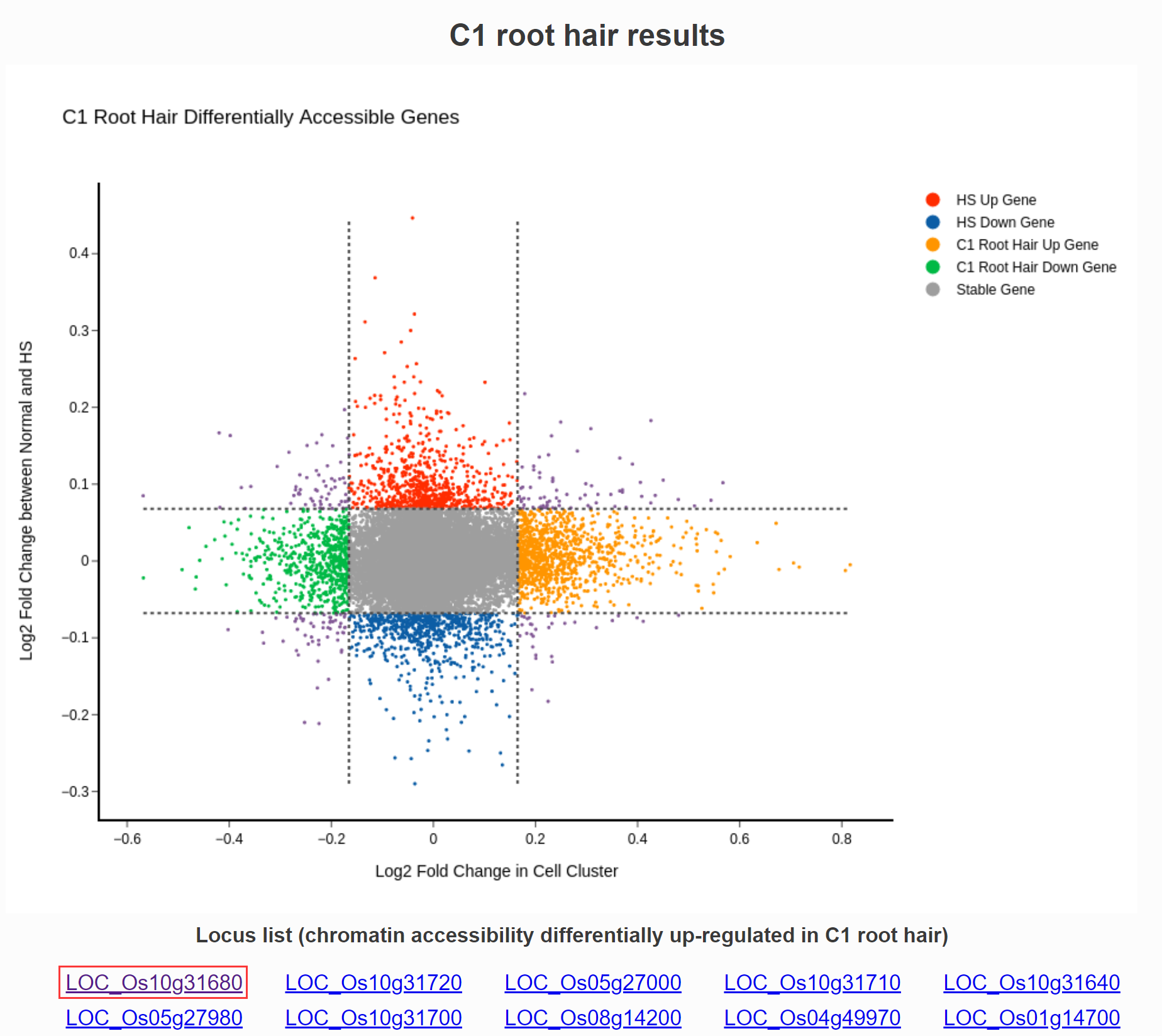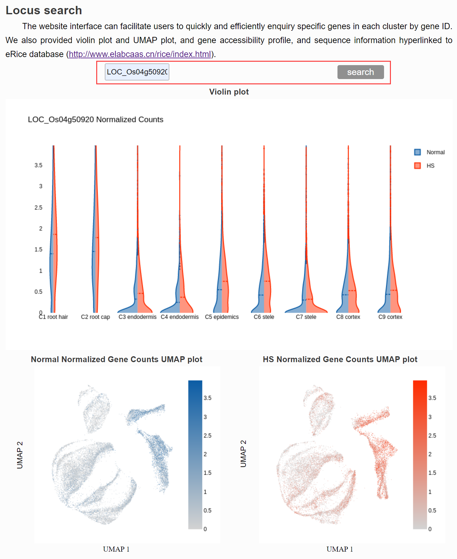 2. For Locus search Users can input "locus" (e.g. LOC_Os10g42750) and then click on the "Search" label, you can search violin plot, and UMAP plot, and gene accessibility profile by scATAC-seq, and sequence information to eRice (http://www.elabcaas.cn/rice/index.html). |