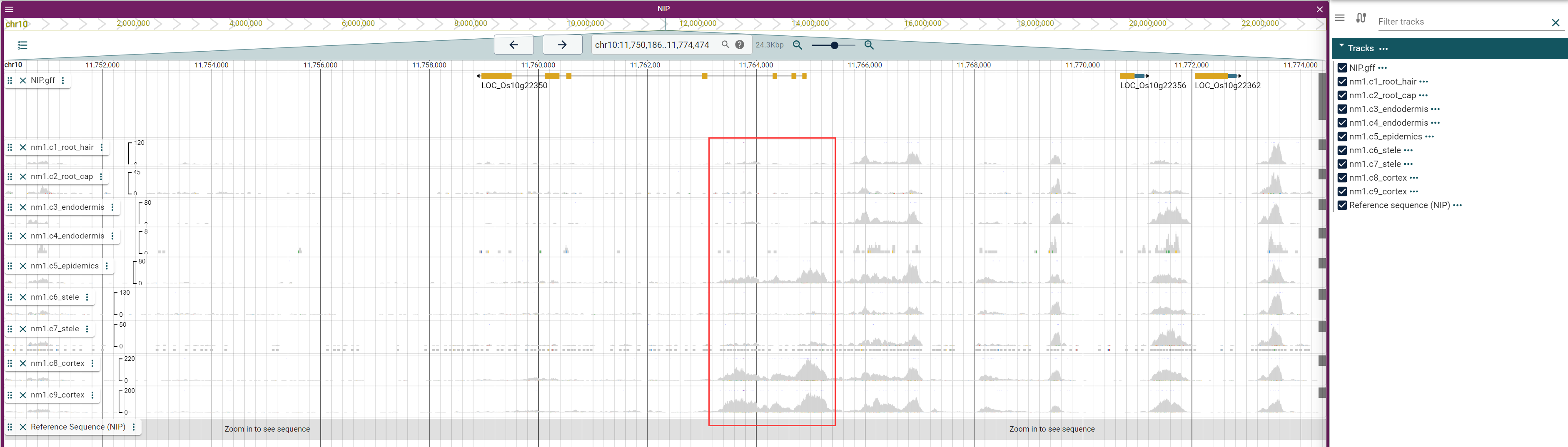 3. For Genome JBrowse In the Genome JBrowse page, users can choose different cluster tracks to obtain genes on the selected region of genome. Example results for locus search: |